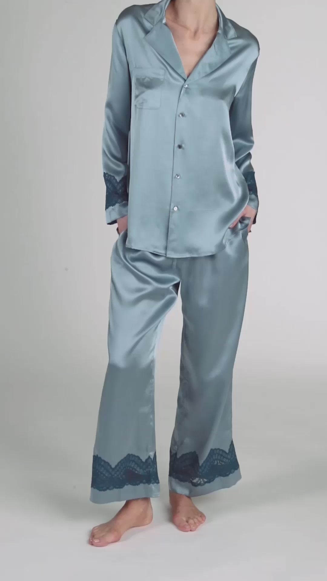 • Pijama con cuello sastre de charmeuse de seda y botones de cierre frontal de nácar.