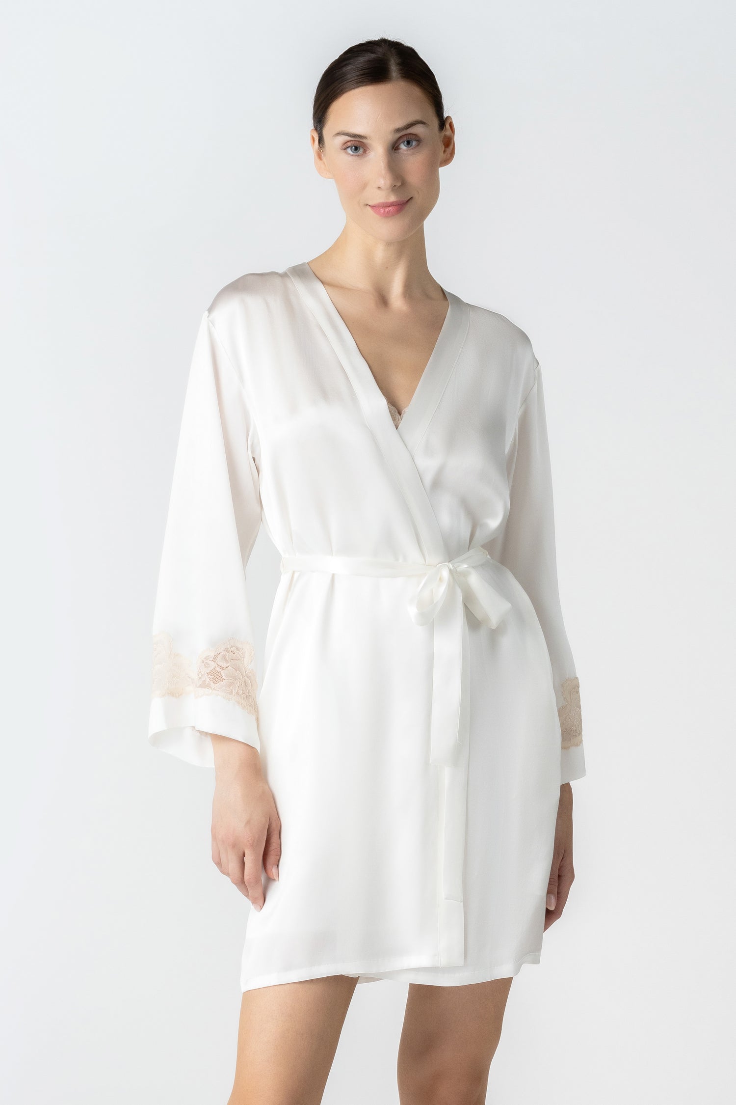La bata corta de seda de tus sueños, que combina la suavidad de la seda con una variedad de tonos. Parte de nuestra colección insignia Morgan, la bata corta de seda Morgan Iconic te envuelve en una celestial charmeuse de seda, adornada con un femenino encaje floral y sus encantadores bolsillos laterales. Esta bata está disponible en una variedad de tonos refrescantes para lucir tu estilo personal mientras te relajas en casa. Queda espectacular con una camisola, como la Morgan Lace Spaghetti Silk Chemise, o con un conjunto a juego como la Morgan Lace Spaghetti Silk Camisole. y pantalones de tap de seda retro Morgan.
