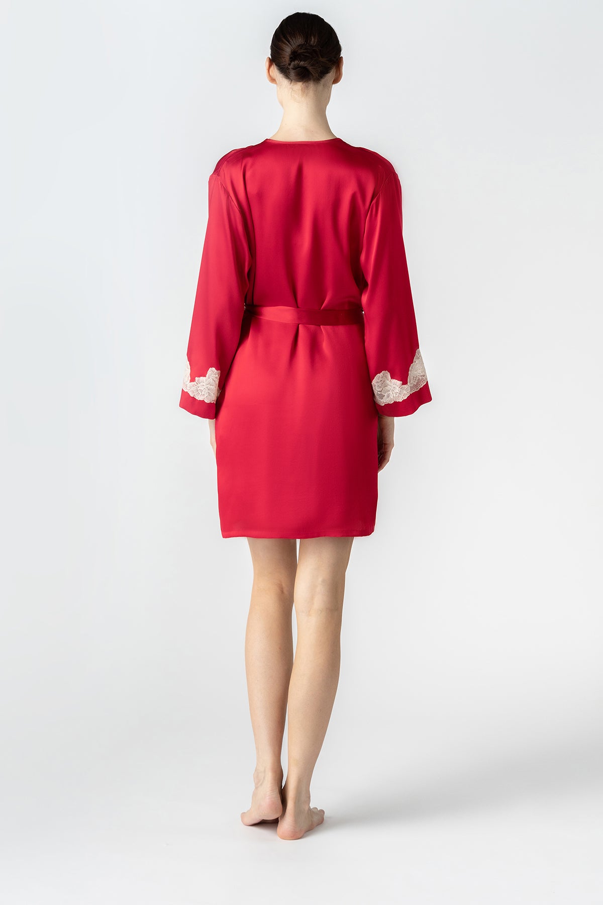 The short silk robe of your dreams, combining buttery soft silk with a variety of tones. Part of our flagship Morgan collection, the Morgan Iconic Short Silk Robe wraps you in heavenly silk charmeuse trimmed with feminine floral lace and much-loved side pockets. This robe is available in many refreshing shades for showing off your personal style while lounging at home. This robe looks spectacular over a chemise, like the Morgan Lace Spaghetti Silk Chemise, or a matching set such as the Morgan Lace Spaghetti Silk Camisole and Morgan Retro Silk Tap Pants.