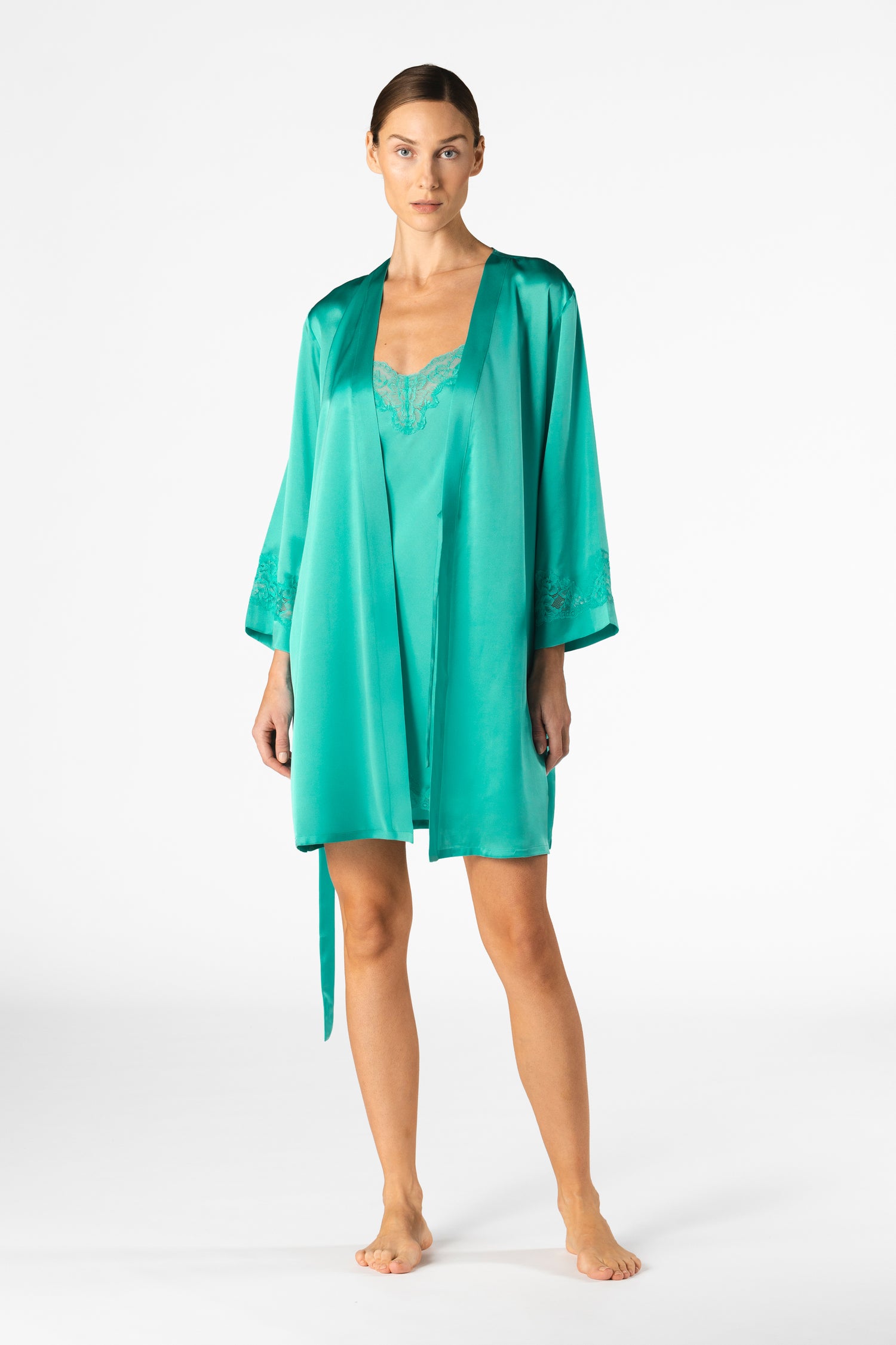 An elegant garment, made for living your best life. This iconic silk slip dress is smooth on the skin with intricate lace detailing. The Morgan collection comes in a variety of vibrant colors, matching your personal style. A versatile style that you can wear by itself, peeking from underneath your favorite dress or accessorized for a night on the town. Elevate this piece at home by pairing it with the Morgan Iconic Short Silk Robe.