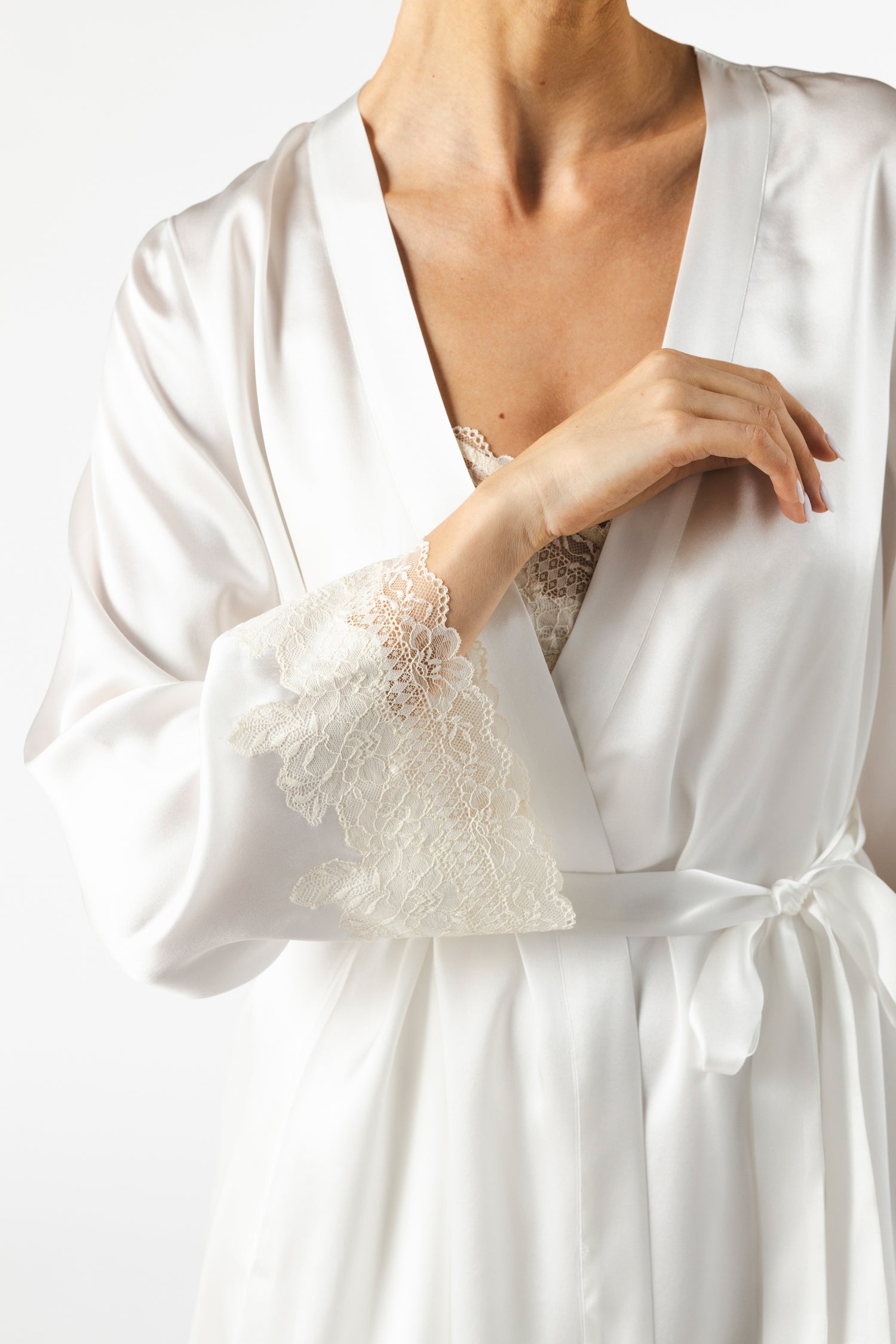Be enthralled by the perfect blend of luxurious comfort and elegant aesthetic in the Virginia Short Silk Robe. Shimmering Ivory silk with Magnolia lace-trimmed sleeves will have you feeling as though you are wrapped in a cloud. Whether you’re getting ready for the day ahead or winding down in the evening, the Virginia Short Silk Robe will ensure you’re feeling as pampered as Lady Love herself.