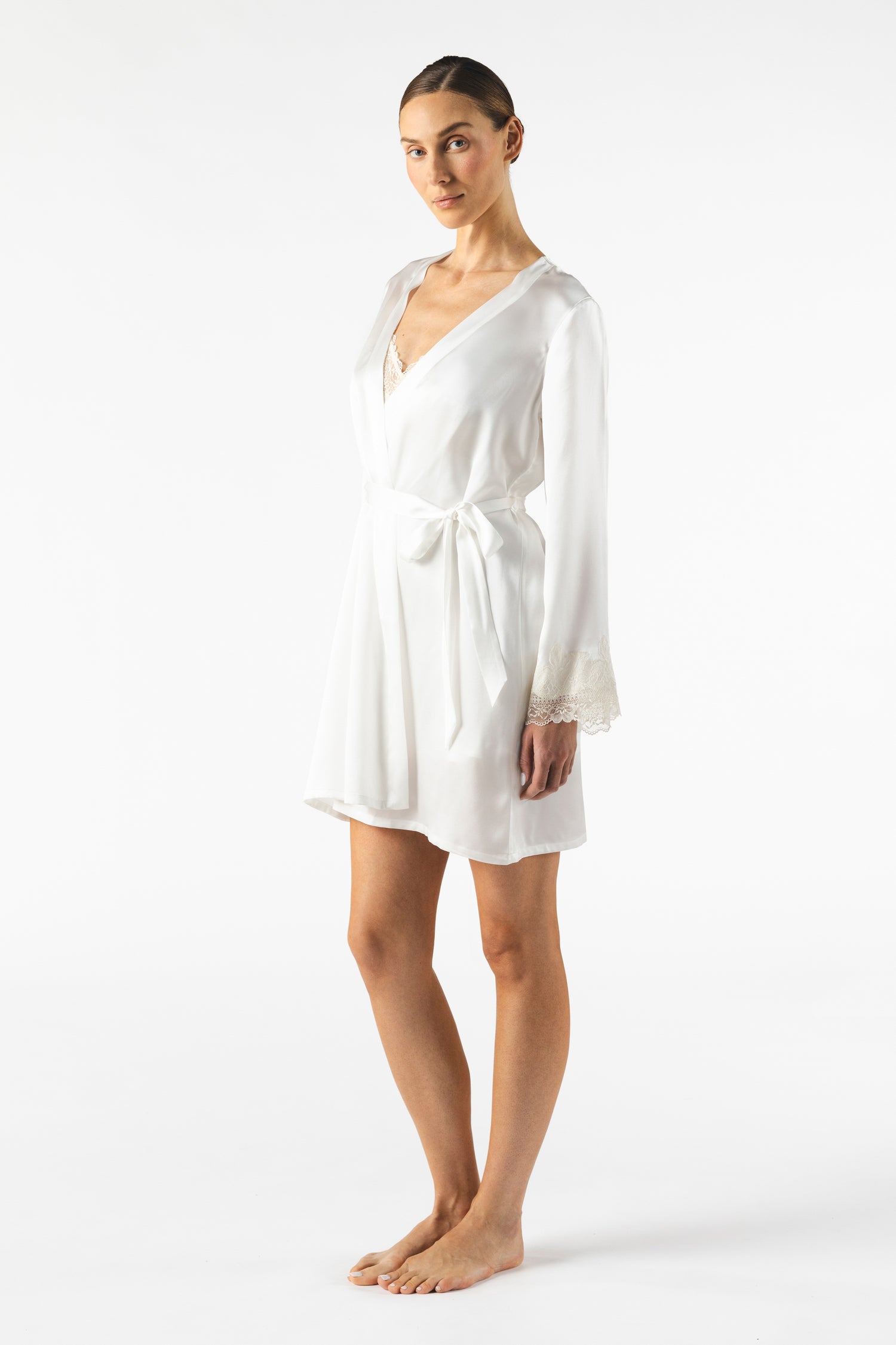 • Eye-catching silk charmeuse flared short robe.